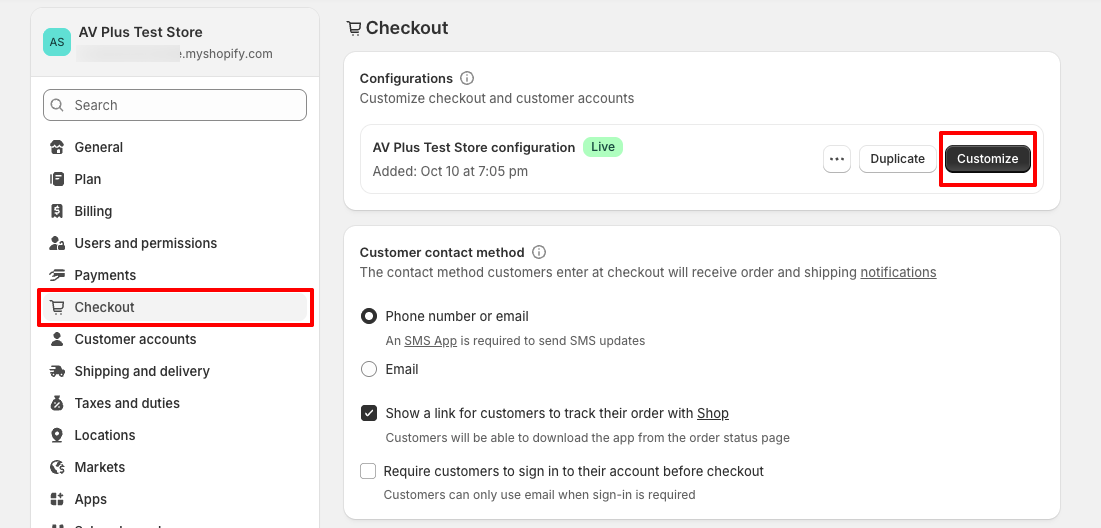 In your Shopify Admin, navigate to Settings page, Click on Checkout. Under Configurations click Customize .