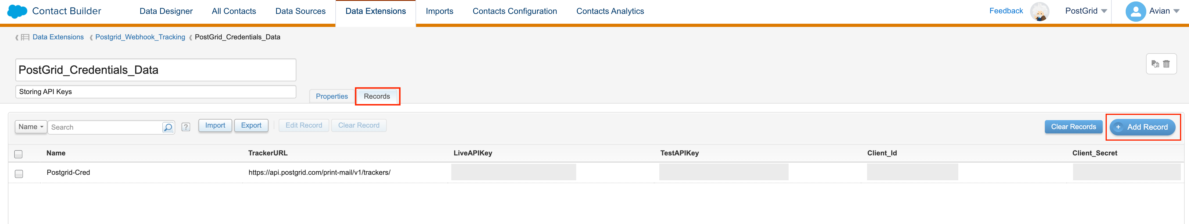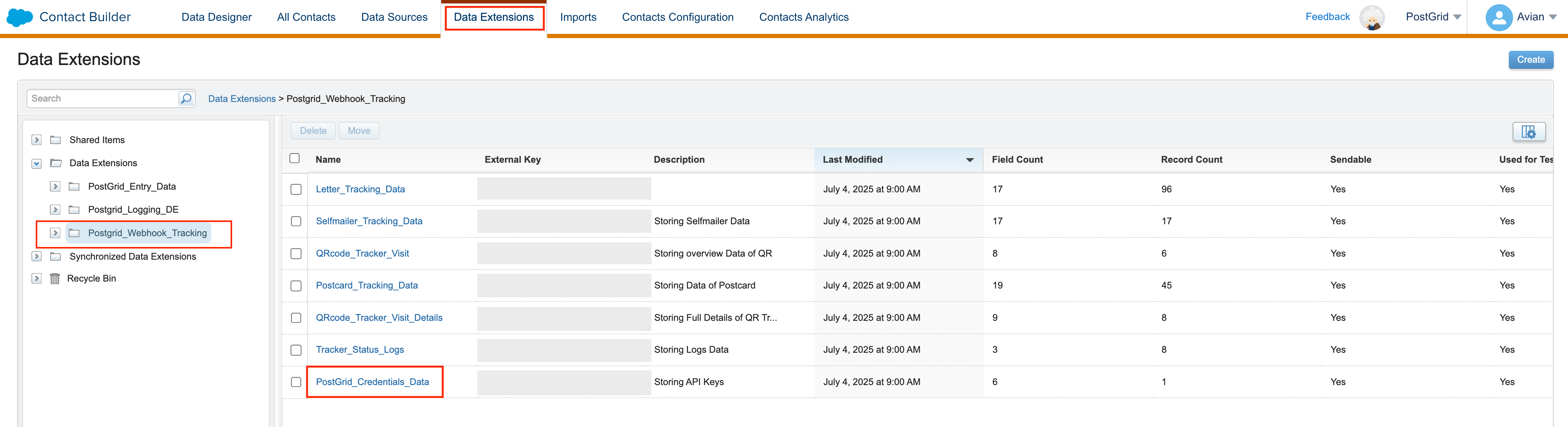 Go to Data Extensions click on PostGrid_Webhook_Tracking and go to PostGrid_Credentials_Data.