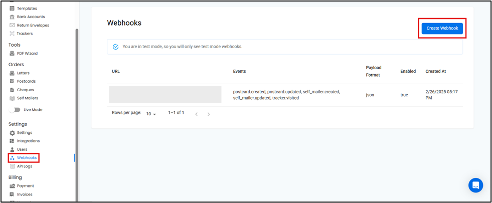 In your PostGrid account, navigate to the webhook page from the menu. Click on the Create Webhook button in the Top-right Corner.