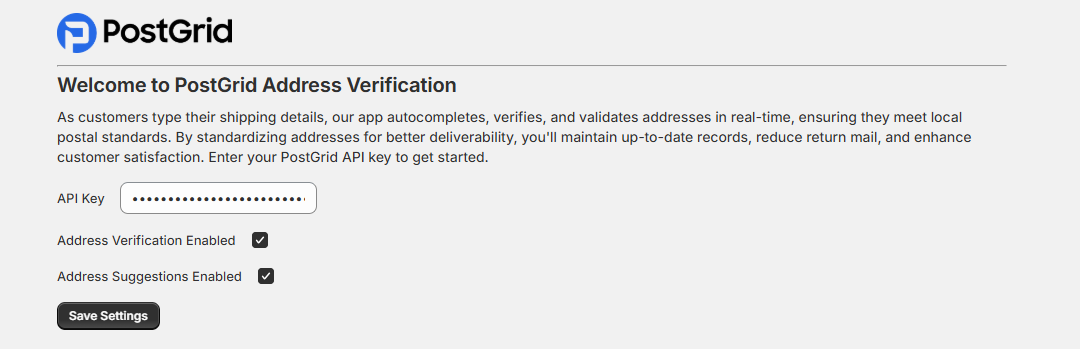 Once the app is installed, you’ll need to connect your PostGrid account to enable address verification and suggestions.