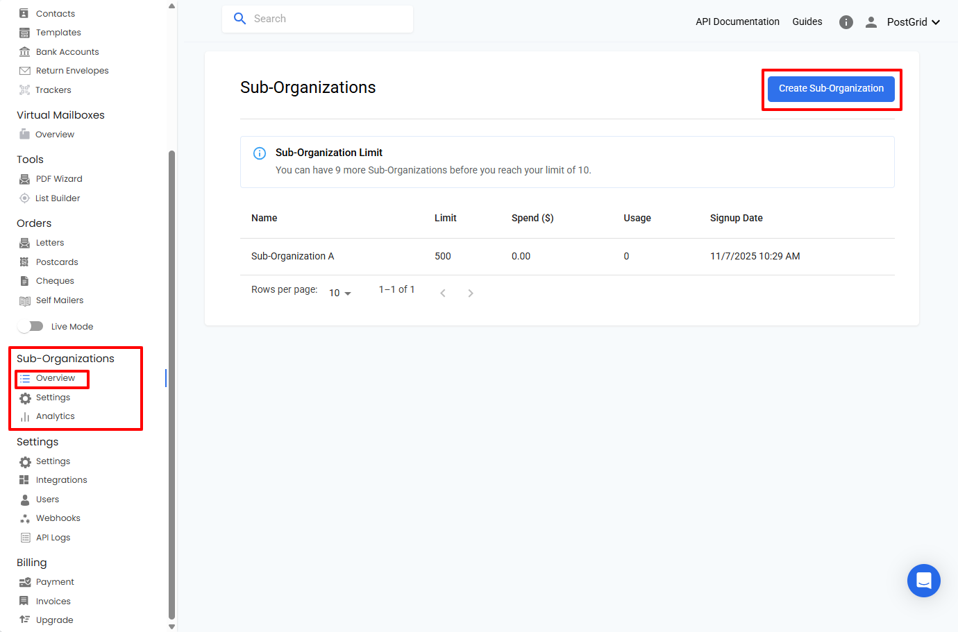 - Sub-organizations automatically inherit billing access to Live Mode and can send mailings via PostGrid without entering their own payment information.