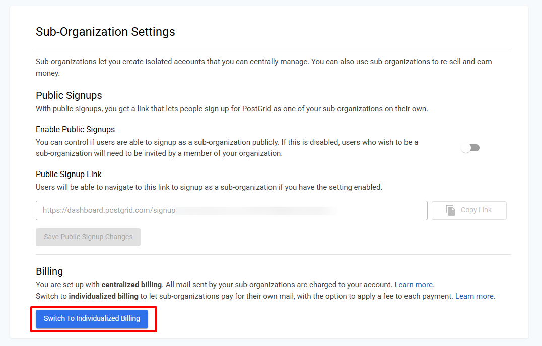 Once you have access to the feature, as a parent organization, you need to create a Stripe Connect account, which links to PostGrid. To get started, click on Switch To Individualized Billing, and go through Stripe's onboarding process for setting up a connected account.