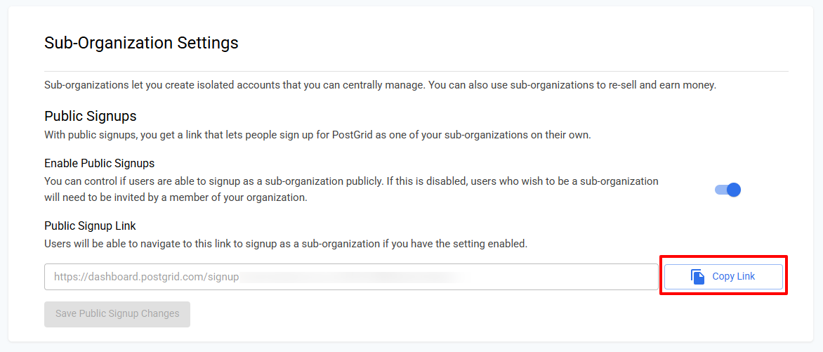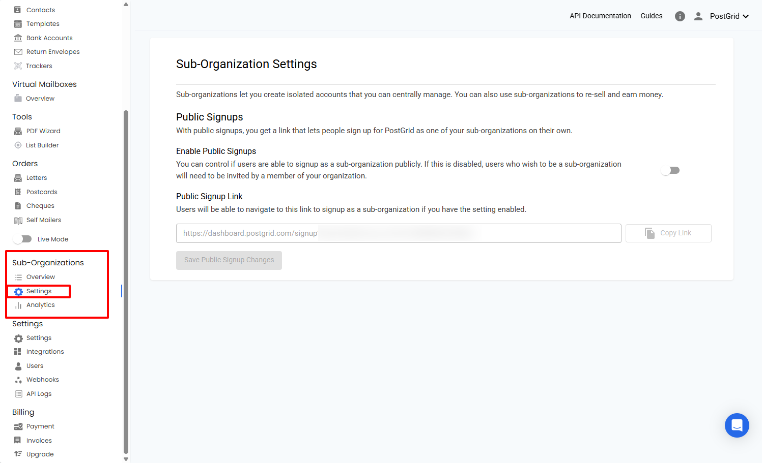 - Public Signups: share a link that allows anyone to register a new sub-organization under your account.