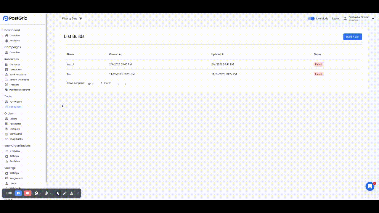 - From your PostGrid dashboard, navigate to Tools → List Builder in the left-hand sidebar.