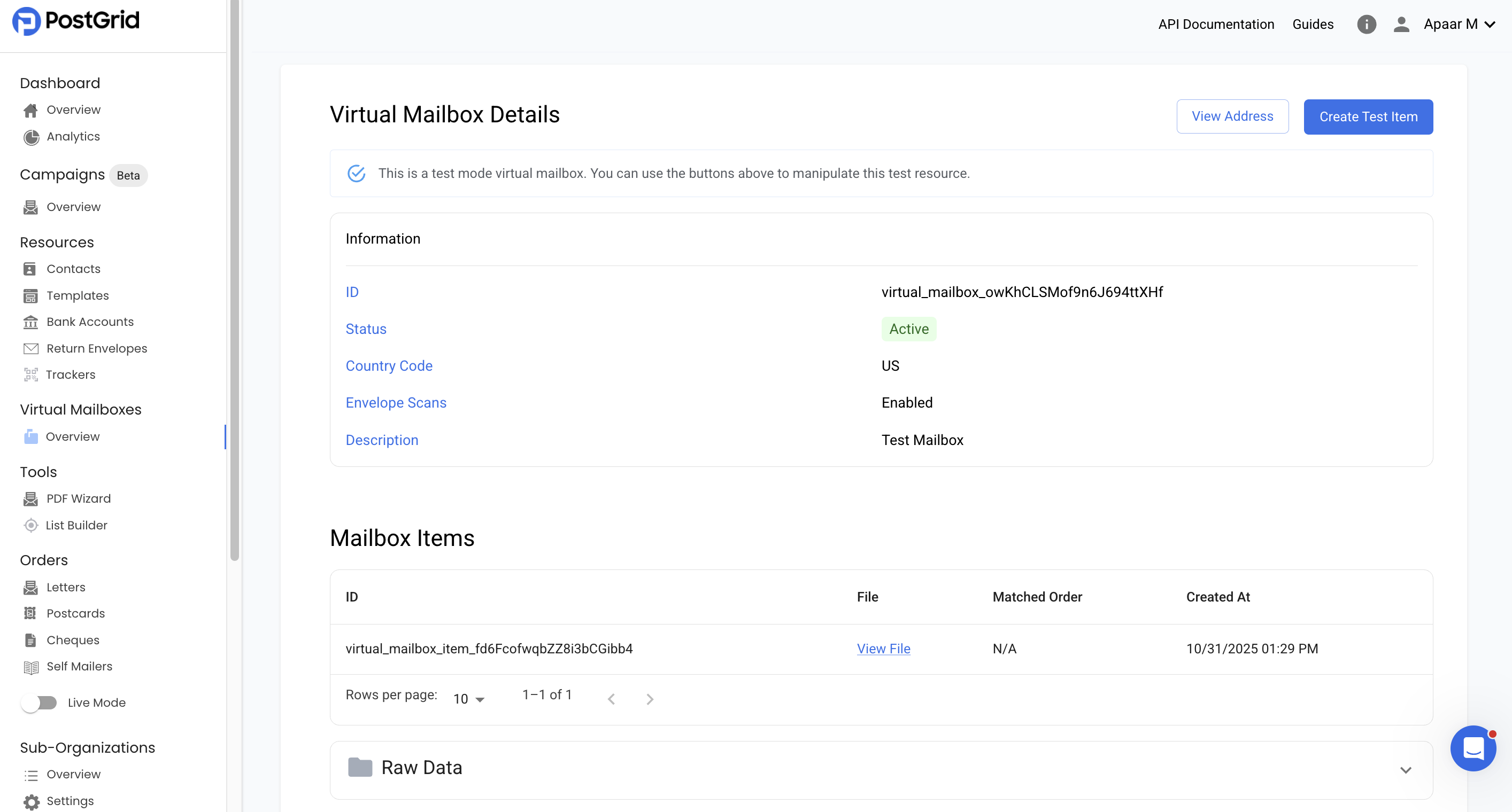 Q: What is the difference between Test Mode and Live Mode for virtual mailboxes? A: In Test Mode, virtual mailboxes become active immediately, and you can create "Test Items" to simulate mail arrival and webhook triggers without actual physical mail. In Live Mode, mailboxes initially enter a "Pending Assignment" state while PostGrid assigns a physical mailbox address within its network. Real mail is required for items to appear.